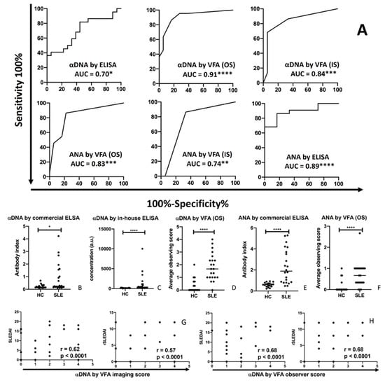 Disease-discriminating power of the duplex ANA–αDNA VFA and ELISA. (A) Serum autoantibody levels in 22 SLE and 18 HC serum samples assayed using the duplex ANA–αDNA VFA (OS or IS) and ELISA. Their ability to discriminate SLE patients from HCs was assessed using ROC AUC values. (B–F) The levels of autoantibodies assayed in SLE patients and HCs using the 2 different platforms plotted and analyzed using a Mann–Whitney U-test. (G,H) SLEDAI and rSLEDAI disease activity values (Y-axis) in all SLE patients with these values (20 out of 22) plotted against αDNA levels (X-axis), as assayed via the VFA (IS or OS), with Pearson’s correlation. * p < 0.05, ** p < 0.01, *** p < 0.001, **** p < 0.0001 as determined using Mann–Whitney U-test. AUC: area under the curve; IS: imaging score; OS: observer score; SLEDAI: Systemic Lupus Erythematosus Disease Activity Index; rSLEDAI: renal SLEDAI.