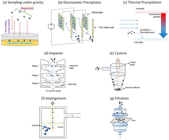 Many traditional and modern techniques are used to investigate and detect bioaerosol samples’ properties. A wide variety of bioaerosol samplers are commercially available, and there are many more currently in development. However, most samplers broadly fall into two major categories: passive sampling and active sampling. Figure 1 shows schematics of the sampling methods discussed in this section, and Table 1 summarizes the pros and cons of each method.