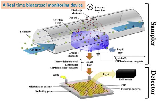 Bioaerosols are defined as small airborne microbiological particles including pathogenic or non-pathogenic bacteria, viruses, fungi, spores, archaea, or other fragments [1]. They also consist of pollens, other organic matter, toxins, and their by-products, such as peptidoglycans, allergens with high molecular weight, endotoxins, and mycotoxins, and they can be either viable or non-viable in nature wherever applicable [2]. They are dispersed in the ambient air. They range from micro-sized viral particles to 1 mm pollen grains. Moreover, they are present in a mixture of droplets, salts, dust, etc. So, it is necessary to efficiently separate and collect the target bioaerosols in the environment prior to bioanalysis [3,4].