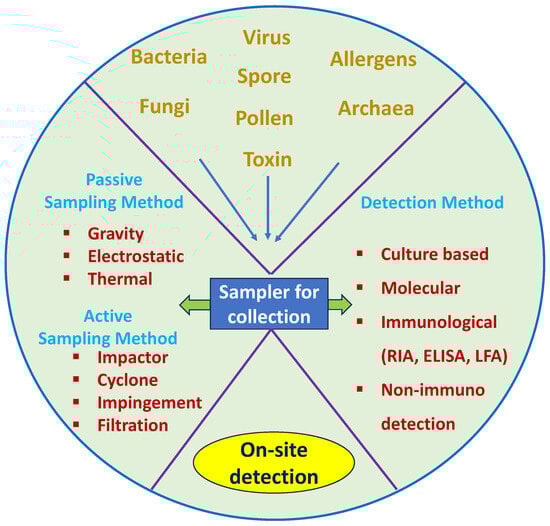 The detection of bioaerosols is the most important step in bioaerosol monitoring and the effective and efficient quantitative determination of airborne bioaerosols. The basic traditional method of detection is the culture method where after the collection of the samples on agar plates, they are cultured through some type of incubation protocol. This favors bioaerosol growth for analysis. As mentioned above, this method is not suggested because of its many limitations, such as its lack of purity. Apart from that, bioaerosol detection methods can be divided into two major categories: molecular detection methods and immunological detection methods. Molecular detection methods include polymerase chain reaction (PCR), mass spectrometry and sequencing, LAMP, and so on. Radioimmunoassay (RIA), fluorescent immunoassay (FIA), enzyme immunoassay (EIA), and enzyme-based halogen immunoassay (HIA) are considered traditional immunological detection methods, whereas fluorescence and chemiluminescence are some of the emerging immunological detection methods for the on-site detection of bioaerosols [95].