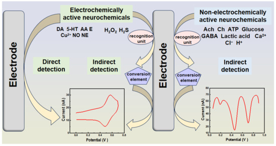 Electrochemically active substances can undergo direct redox reactions at the electrode interface, generating electrical signals for direct monitoring. However, non-electrochemically active neurochemicals require specific recognition units to capture and then convert chemical signals into electrical signals for indirect detection, because the redox potentials of some electrically active neurochemicals overlap extensively in vivo, and indirect monitoring methods are also available to improve selectivity. The in vivo neural environment is complex, featuring low analyte concentrations and thousands of potential interfering compounds, making sensitivity and selectivity crucial challenges in designing effective electrochemical sensors. In this way, advancements in various nanomaterials and recognition units have been instrumental in enhancing sensitivity and selectivity for detecting various neurochemicals.
