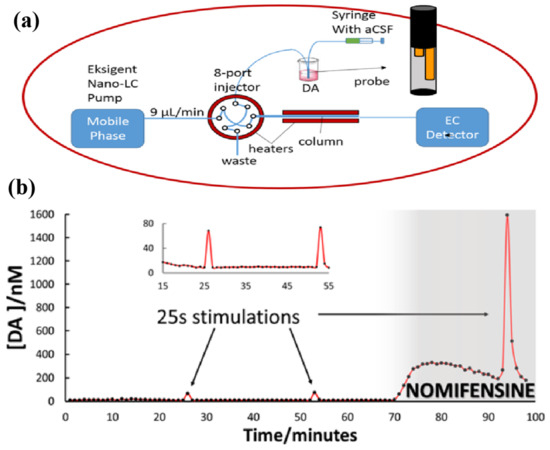 - Ngo, K.T.; Varner, E.L.; Michael, A.C.; Weber, S.G. Monitoring Dopamine Responses to Potassium Ion and Nomifensine by in Vivo Microdialysis with Online Liquid Chromatography at One-Minute Resolution. ACS Chem. Neurosci. 2017, 8, 329–338. [Google Scholar] [CrossRef]