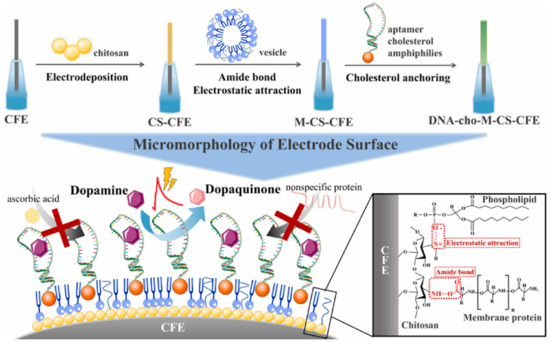 Schematic illustration of the fabrication of DNA-cho-M–CS–CFE and the DA measurement in the micromorphology of the electrode surface. (The red dotted box is the binding sites of chitosan to phospholipids and membrane proteins, respectively.) Reprinted from Ref. [228] with permission. Copyright 2023 Elsevier B.V.