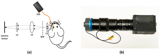 Figure 2a illustrates the schematic diagram of the experimental setup for in vivo retinal imaging of rat eyes. The light source is a visible light LED (M530L4, Thorlabs Inc., Newton, NJ, USA) with a center wavelength of 530 nm and a full-width half maximum (FWHM) of 35 nm. For albino rats, the contrast of the retinal vasculature is poor when visualized with red and NIR light, and the UV portion of the spectrum is heavily attenuated by the ocular lens. Therefore, the choice of wavelength in the green portion of the spectrum was made as it shows the retinal vessels with excellent contrast [28]. An optical fiber (MHP550L02, Thorlabs Inc., Newton, NJ, USA) coupled the LED light to the eyelid of the rat and the end of the fiber was fixed to the eyelid with tape. The optical power at the tip of the fiber was measured to be 5 mW. The imaging system consisted of the transparent ultrasound probe as the frontal element, followed by an ophthalmic lens (L1) (f = 11 mm) (Volk Digital Series Wide Field lens, Volk, Mentor, OH, USA), a relay lens (L2) (f = −50 mm, LC1715, Thorlabs Inc., Newton, NJ, USA), and a camera lens (L3) (12 fixed focal length lens, 33-303, Edmund Optics Inc., Barrington, NJ, USA). The working distance of L1 was chosen with the thickness of the transparent ultrasound probe in mind, so that, when the transducer touches the cornea properly, a retinal image is created by L1 at the retina conjugate plane (RCP) and this image is relayed to the camera sensor (GS3-U3-41S4M-C, FLIR Integrated Imaging Solutions Inc., Richmond, BC, Canada) by L2 and L3. Figure 2b shows a photographic illustration of the imaging system.