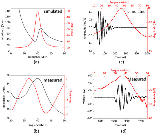 (a) Simulated and (b) measured electrical impedance and phase spectrum of the transducer. (c) Simulated and (d) measured pulse−echo performance of the transducer.