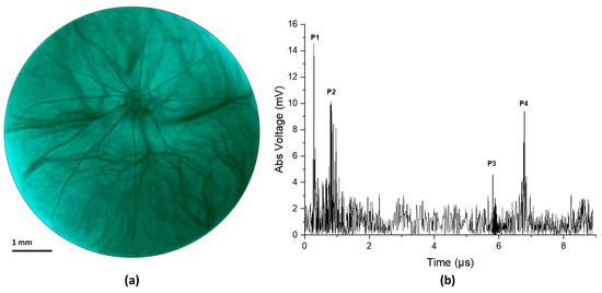 Figure 4 illustrates the result from an in vivo experiment in a rat eye. Figure 4a shows the fundus image and Figure 4b shows the corresponding ultrasound pulse-echo image. The acquired pulse echo signal constitutes both positive and negative voltage. However, to ensure similarity with the clinical ocular ultrasound pulse-echo signal, we illustrated the absolute voltage instead of the real voltage. It is evident from Figure 4a that the retinal and choroidal vessels as well as the optic nerve of the rat retina are clearly imaged in the fundus photograph. The ultrasound data show four distinct peaks corresponding to four anatomical locations inside the eye, namely the cornea (P1), the anterior capsule of the crystalline lens (P2), the posterior capsule of the crystalline lens (P3), and the retina (P4). The axial length of the eye could be approximated from the time interval between the corneal peak and the retinal peak, given that we know the speed of sound in the eye. The speed of sound in aqueous humor and vitreous humor is around 1532 m/s, whereas the speed of sound inside the ocular lens is around 1641 m/s [29]. For conservative estimation, we assume that the speed of sound inside the whole eye is 1532 m/s. We find the axial length of the eye using the following equation,