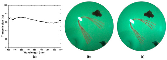 Figure 5a illustrates the optical transmission spectrum of the ultrasound transducer. The optical transmission is above 80% in the blue, green, and red portion of the spectrum and goes slightly below 80% at the NIR portion of the spectrum. The effect of the transparent transducer on the imaging performance of the system is illustrated in Figure 5b,c. Figure 5b illustrates an image of the retina of an eye model taken with the proposed prototype. Figure 5c illustrates an image of the retina of the same eye model taken after replacing the transparent transducer with an optically neutral glass window. The glass window was chosen in such a way that it did not change the magnification of imaging and only the difference in imaging performance would be highlighted. The structures present in the eye model, namely the blood vessels, the optic nerve head, and the pigmented ocular lesions on the superior and inferior retina could be easily identified in both images. The mean RGB intensity of the images taken with the transparent transducer and the glass window are 121 and 135, showing the illumination efficiency of the device is not severely affected by the transparent transducer. The ocular vessel branches present in the model eye are clearly seen in both images. However, the smaller vessels that constitute the vessel branches could be differentiated in the image taken with the glass window, whereas the image taken with the transparent transducer does not resolve the smaller vessels in the vessel branches clearly. That being said, the quality of the image taken with the transparent transducer should be sufficient to accurately guide the ultrasound signal to ocular lesions, which is the goal of the prototype.