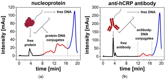 In our study, pre-activated, 48-oligonucleotide-long NHS ester-terminated DNA anchors (ligand strand sequence) were conjugated with proteins. As model protein receptors were taken: (i) anti-hCRP monoclonal antibody (chosen for detection of CRP as inflammatory biomarker) and (ii) SARS-CoV nucleoprotein (receptor for serological biomarkers of COVID-19). The amine coupling reaction mixtures were subjected to preparative chromatographic separation using gradient elution and representative chromatograms are shown in Figure 1. As can be seen, non-conjugated proteins are characterized by the shortest retention times. The attachment of a single DNA strand (1:1-type conjugates) and more (multiple-tagged conjugates) resulted in a significant interaction enhancement, resulting in gradually longer retention times. Unbound DNA leaves the column as the last, as it exhibits the most anionic character. In both cases, shown in Figure 1, DNA-protein conjugates were found in the post-reaction mixture. To confirm the correct assignment of the observed signals to the respective fractions, chromatograms from the analysis of a sample containing only DNA and a mixture of protein and DNA (unconjugated) are shown in Figure S1a. In addition, the effect of NHS-based crosslinker on DNA ligand strand was examined to rule out the possibility of its spontaneous crosslinking (Figure S1b). A more in-depth discussion on the selectivity of the amine coupling and reactivity of NHS esters with exocyclic amine groups of nucleobases and the differences in coupling efficiency for individual proteins can also be found in Supplementary Material.