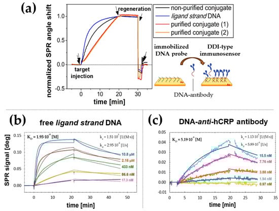 The relevance of the purification process of DNA-protein conjugates was evaluated in our study by comparing their interaction kinetics with DNA probes immobilized on SPR slide (Figure 2a). Normalized sensograms allow a comparison of the binding kinetics of two fractions of DNA-mAb anti-hCRP conjugates (with 1:1 stoichiometry and multiply tagged) to a layer of immobilized DNA probes. SPR responses were also recorded for the reaction mixture after conjugation but without chromatographic purification and for free ligand strand sequence (corresponding to DNA tag) as a reference. As shown in Figure 2a, according to our expectations, the significant difference in the SPR response profile for the conjugates before and after purification indicates a substantial contribution of binding unconjugated DNA strands to the receptor layer. The flat, nearly linear evolution of the SPR signal at the step of conjugate association indicates a noticeably slower kinetics of its binding to the surface, typical for bulky ligands whose binding is further limited by diffusion processes [28]. The apparent difference in the association curves confirms that the hybridization of unconjugated ligand strand DNA is additionally favored kinetically due to lower steric constraints.