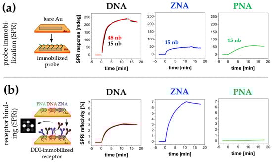 Figure 3. (a) Comparison of SPR responses, which reflect direct chemisorption of thiol-terminated DNA, ZNA® and PNA probes on the surface of a gold SPR transducer during probes immobilization. (b) SPRi responses representing hybridization of the oligonucleotide probes with fully complementary ligand strand sequence. In both cases, red sensograms refer to a “long” DNA probe (48 nb) and black sensograms refer to a “short” DNA probe (15 nb).