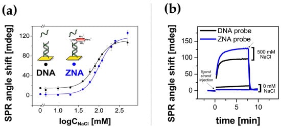 Figure 5. (a) The relationship between ligand strand target concentration and its hybridization efficiency with immobilized DNA (black dots) and ZNA® probes (blue dots). Relative signal values were calculated from differential SPR sensograms after the association equilibrium was reached (n = 2), (b) exemplary SPR responses recorded for ligand strand injections in high ionic strength medium (10 mM phosphate buffer pH 7.4 with 500 mM NaCl) and low ionic strength medium (10 mM phosphate buffer pH 7.4 with 0 mM NaCl). Distilled water was used as the running buffer.