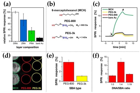 Figure 6. (a) Normalized SPRi signals recorded as responses of DNA, PNA, and ZNA® monolayers and bare gold to injection of unconjugated rabbit IgG antibody (10 µg/mL), (b) structures of thiolated backfilling agents (BA) used within this study, (c) SPRi sensograms (left), (d) SPRi differential image depicting the interactions of monolayers composed of backfilling agents (MCH, PEG-800, PEG-3k) and bare gold with unconjugated rabbit IgG antibody (10 µg/mL), (e) and (f) SPRi signal values, which represent hybridization efficiencies of mixed monolayers containing immobilized DNA probe and ligand strand sequence, as a function of (e) type of PEG-based backfilling agent used (molar ratio of DNA probe to BA = 1:4), (f) molar ratio of DNA probe to PEG-800 in the immobilization mixture (n = 3).