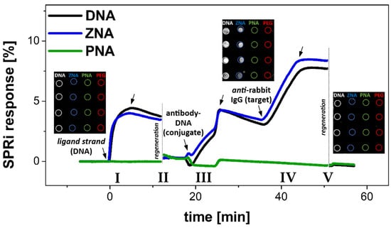 Figure 7. Average values of SPRi signal changes for the optimized composition of DNA-modified layer (co-immobilization of DNA probe and PEG-800 at molar ratio 1:4, (0.1 µM DNA probe + 0.4 µM PEG-800), PNA- and ZNA®-modified layer (immobilization of PNA and ZNA® probe followed by surface blocking with PEG-800). The sensograms show the subsequent processes: (I) binding of unconjugated ligand strand sequence (preliminary quality control of the immobilized probes), (II) surface regeneration by means of injection of 50 mM NaOH, (III) injection of DNA-anti-hCRP antibody conjugate, (IV) injection of anti-mouse IgG (as model analyte), (V) complete regeneration of DDI-based biosensor. PBST buffer pH 7.4 was used as a running buffer and for all dilutions. Insets show differential SPRi images, which visualize the observed differences in reflectivity for different oligonucleotide probes.