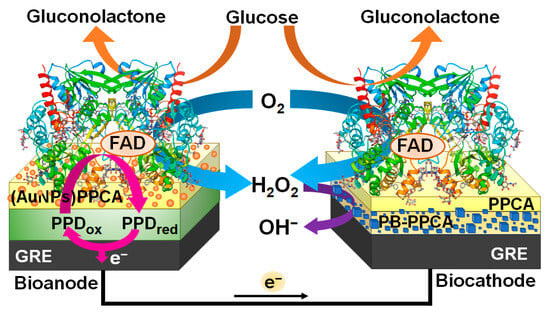 The amperometric glucose biosensor based on an enzymatic biofuel cell investigated and described in this work was constructed by coupling a bioanode and a biocathode modified with the same enzyme—GOx (Figure 1). A GRE electrochemically modified with a layer of PB nanoparticles embedded in a PPCA shell and an additional layer of PPCA was used as the cathode. Meanwhile, a GRE electrochemically modified with a nanocomposite composed of PPD and AuNPs entrapped in a PPCA shell was used as the anode. PPCA not only allowed for the covalent immobilization of GOx on the surface of both electrodes but also protected the surface from contamination due to its perm-selectivity properties. In the presence of glucose, PPD was able to transfer electrons generated during GOx-catalyzed glucose oxidation from the redox-active prosthetic group of the enzyme to the surface of the bioanode, and AuNPs were able to facilitate this electron transfer [31]. The presence of metallic species in the bioanode structure has been shown to increase its surface electronic conductivity and thus improve the electron transfer processes [32]. Meanwhile, PB nanoparticles on the surface of the biocathode exhibited electrocatalytic activity towards the reduction of hydrogen peroxide, which was generated during the enzymatic reaction occurring on both bioelectrodes [30]. The combination of these two bioelectrodes made it possible to develop the glucose biosensor based on the single-enzyme biofuel cell [29], of which the bioanode and biocathode were powered by the same substrate—glucose.