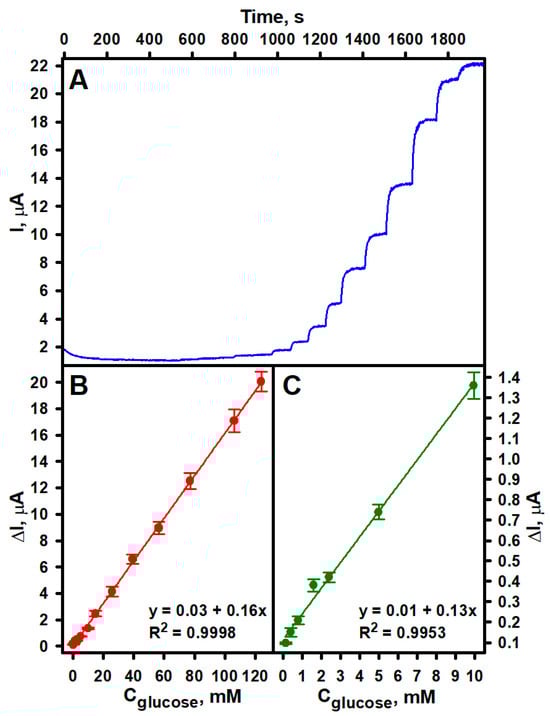 Dependence of the current generated by the developed sEGBFC-based biosensor on glucose concentration (A) and calibration curves at different intervals of glucose concentration (B,C). Measurement conditions: APB-KCl, pH 6.0; 0.3 V applied voltage.