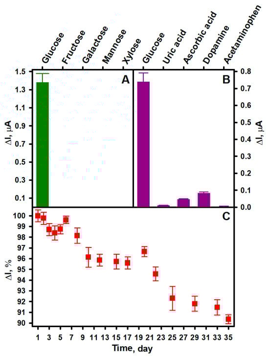 Comparison of the current response of the developed sEGBFC-based biosensor to glucose and other saccharides (A) and glucose and interfering substances (B). The current response of the developed sEGBFC-based biosensor vs. time (C). Measurement conditions: APB-KCl, pH 6.0; 10.0 mM glucose (A,C), fructose, galactose, mannose, and xylose (A); 5.0 mM glucose, 0.5 mM uric acid, 0.2 mM ascorbic acid, 0.1 mM dopamine, and 0.2 mM acetaminophen (B); 0.3 V applied voltage.