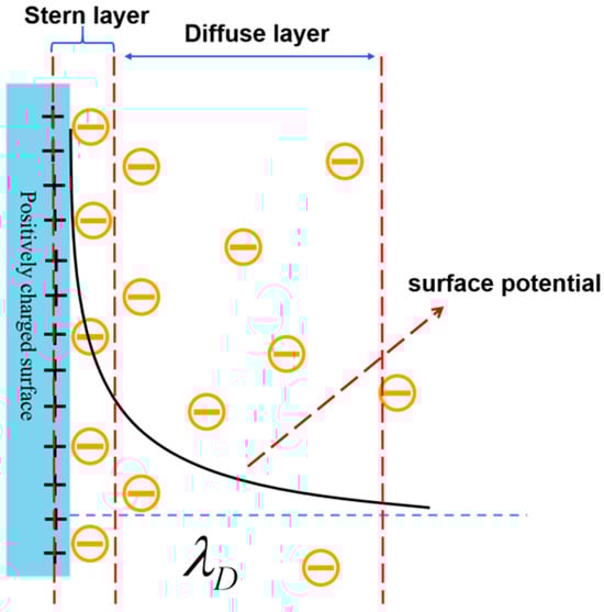 Schematic diagram of the electric double layer (EDL) and the corresponding exponential decline of the surface potential when increasing the distance [38].