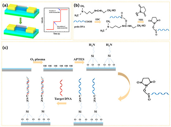 To maintain the sensitivity and specificity of biosensors, the surface modification is critical. Accordingly, a single-strand DNA was employed to achieve firmly covalent binding with the surface of 3D-SiNS-FET. Specifically, the sensor surface was treated with oxygen plasma for 3 min to create more hydrophilic surface hydroxyl groups after the device surface was previously cleaned with anhydrous ethanol. The device surface was coated with 1% 3-aminopropyltriethoxysilane (APTES) and left for 30 min to allow the hydroxyl groups on the surface to bond with the siloxyl groups in the APTES. The unreacted APTES was removed by immersing in anhydrous ethanol. The surface was blown with nitrogen and then placed in a vacuum drying oven at 110 °C for 30 min to cure the silylation. At room temperature, the single-stranded DNA was combined with EDC and NHS solution in a 2:1 molar ratio. The combination was then spread over the surface of the device and allowed to sit for 1 h. As a result of the reaction of NHS and EDC, the terminal carboxyl group (-COOH) of the DNA probe was activated (see Figure 3b), which facilitated condensation interaction with the amino group on the sensor surface. It was then dried with nitrogen for storage followed by cleaning with buffer and DI water.