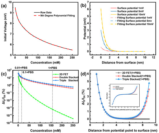 The results of the COMSOL simulation. (a) Surface potential remaining after lowering by a narrow EDL potential at different concentrations. (b) Decreasing trend and curve fitting of a diffusion EDL potential under different surface potentials. (c) Simulation of 2D NW sensitivity at different concentrations compared to double- and triple-stacked NW (d) Simulation of 2D NW sensitivity compared to double- and triple-stacked NW using constant DNA strand length to vary NW spacing.
