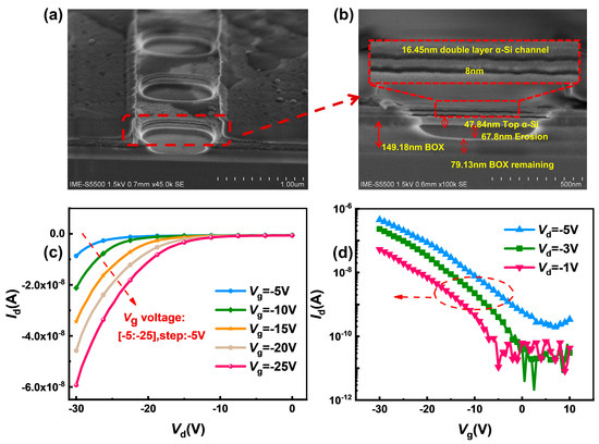 To optimize stack release and preparation efficiency, the Si/SiO2 structure was used to prepare the stack, and HF acted as the etchant due to its ultra-high selectivity ratio of SiO2 over Si. Figure 5a shows a typical SEM image of our 3D-SiNS-FET sensor with a channel length of 1 µM and a width of 500 nm, and it is clear that the spatial 3D stacked structure was successfully formed. To show the details and specific parameters of the structure, the front-view SEM image was partially enlarged, as illustrated in Figure 3b. After HF etching, the channel width was shrunk to 8 nm, leaving a double Si-channel layer with thickness of 16.45 nm and a 79.13 nm-thick BOX layer to prevent the physical contact between the substrate and the solution dropped.