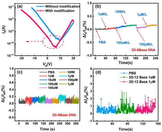 Characterization of modification effects in 3D-SiNS-FET biosensors. (a) Transfer characteristic curves of the modified and unmodified devices. (b,c) Detection of 6-base DNA by the unmodified device. (d) Detection of 12-base DNA by the unmodified device.