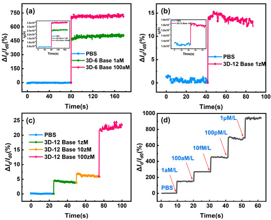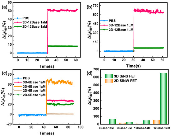 Firstly, the detection of a high concentration (1 µM) of the 12-base DNA molecule solution demonstrates that the current change rate of the 3D-SiNS-FET biosensor is significantly higher than that of the 2D-FET biosensor, reaching 670% (see Figure 8a). It should be highlighted that at a low concentration (1 aM) of 12-base DNA molecule solution, the 3D-SiNS-FET still shows a significant current variability of about 53%, while the current variability is less than 10% in the 2D FET biosensor (see Figure 8b), suggesting a great clinical application potential of 3D-SiNS-FET due to very rare DNA molecules in the blood stream. Similarly, 3D-SiNS-FET biosensors show higher sensitivity to 6-base DNA molecule solutions, regardless of high (1 µM) or low (1 aM) concentrations (Figure 8c).