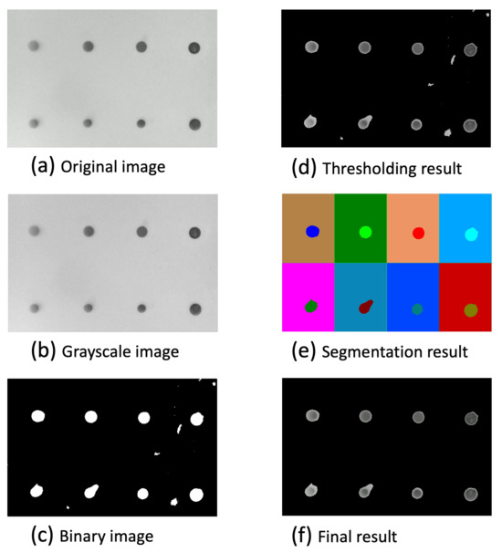 Multiple advanced image processing methodologies were employed to enhance the accuracy and efficacy of biomarker signal detection in our study. The pipeline of the image processing for biomarker signal detection is shown in Figure 2. The colorimetric microarray image was first converted to the 8-bit single-channel grayscale image. Then, the grayscale image was blurred using a (21 × 21) Gaussian filter for better thresholding results that convolved the source image with the specified Gaussian Kernel. Instead of using global thresholding techniques like OSTU [27], the adaptive thresholding technique [28] was utilized, which calculates the threshold for each pixel based on its surrounding region, thereby offering enhanced performance for images with varying illumination conditions. Moreover, the quality of the resulting binary image is insufficient for direct pixel value extraction due to the presence of noise. The binary image is further divided into 2 × 4 small areas to be further processed. The connected component labeling and analysis technique was implemented to identify the contiguous areas within the image. Components presenting an area below a predefined threshold were classified as noise and subsequently filtered out, ensuring a more accurate signal detection. Finally, the intensity for each biomarker was calculated based on the mean of the pixel intensities of the labeled components.