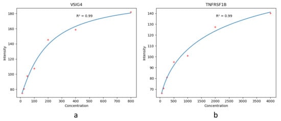 where x is the intensity, and y is the concentration. The four estimated parameters are the following: a represents the obtained minimum value, b represents the obtained maximum value, c represents the points of inflection, and d represents the curve’s Hill’s slope. The fitted 4PL curve of each biomarker is shown in Figure 3.
