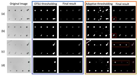 Comparison of OTSU thresholding and adaptive thresholding. The comparison includes four samples (a–d) showcasing the original image, the binary image result of OTSU thresholding, the final segmentation result after applying OTSU thresholding, the binary image result of adaptive thresholding, and the final segmentation result after applying adaptive thresholding. Samples (a,b) demonstrate instances where OTSU fails to fully capture biomarker spots, while samples (c,d) depict cases where OTSU misses subtle biomarker spots. The biomarker spots successfully captured by adaptive thresholding are highlighted using red rectangles.