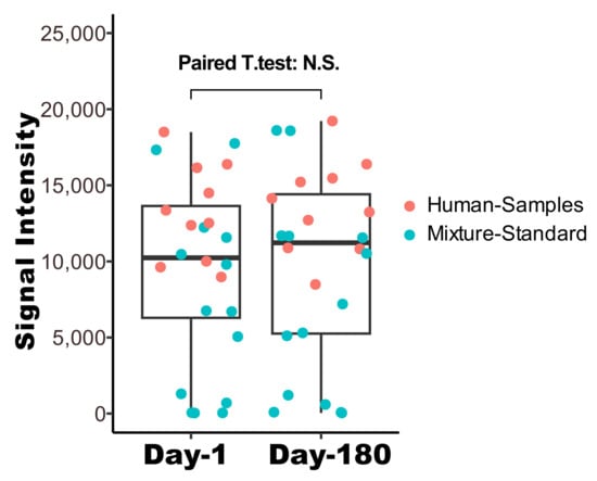 The colorimetric images were additionally obtained six months after the initial experiment, with microarray slides stored at 4 degrees in a dark environment. We demonstrate in Figure 5 a comparative analysis of the signals collected at two distinct time points: Day 1 versus Day 180. A paired t-test was performed to compare the human samples and standard mixtures 180 days apart, and the results showed statistically no significant difference between the two groups, with p-value 0.13. These results illustrate an insignificant variation in signal intensity between the initial and subsequent measurements, thereby underscoring the robustness of the microarray signals for long-term preservation and the stability of the signals.