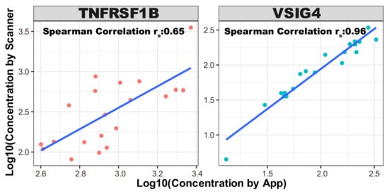 The colorimetric intensity values, corresponding to each biomarker within the microarray images, were quantified utilizing a laboratory scanner software GenePix Pro 7, a widely utilized tool for scanning protein microarrays, and our proposed method, respectively. In order to investigate the potential statistical correlations between the scanner-derived data and the data obtained from the application, we computed the nonparametric Spearman’s rank correlation coefficient [29]. The correlation plot for each biomarker is shown in Figure 6. The Spearman’s rank correlation between app value and scanner value is 0.85. The Spearman’s rank correlation for individual biomarkers is 0.65 for TNFRSF1B and 0.94 for VSIG4.
