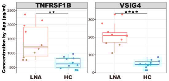 The box plot for concentration and two groups of data for each biomarker. LNA stands for LN active, and HC stands for healthy control. Asterisks designate the level of statistical significance: ** p < 0.01; **** p < 0.0001.