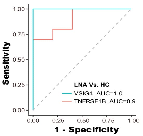 We further employed each biomarker as a feature for classifying samples into two groups: LN patients and healthy controls. The receiver operating characteristic (ROC) curve for each biomarker is displayed in Figure 8. The ROC curve for VSIG4, shown in blue, has an area-under-the-curve (AUC) of 1.0, indicating perfect discriminative ability, meaning it correctly identified all LNA cases and HC without any overlap. On the other hand, the TNFRSF1B curve, in red, with an AUC of 0.9, also shows high discriminative power, albeit with some overlap between the two groups. Both elevated AUC values signify a robust capability to accurately discern LN patients from those in the HC group.