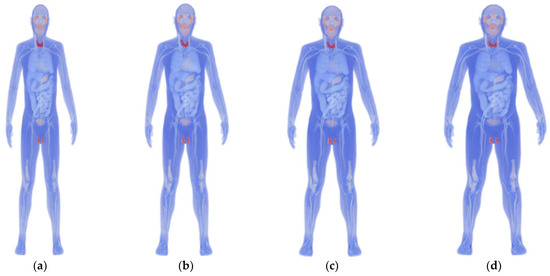 Anatomical numerical human body models developed using the 4D extended cardiac-torso (XCAT) phantom representing (a) underweight (BMI: 17.2), (b) normal (BMI: 23.2), (c) pre-obese (original) (BMI: 28.5), and (d) obese (BMI: 34.2).