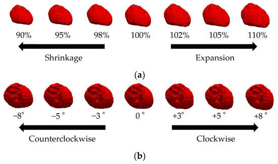 Given that the heart’s size and orientation also contribute to interindividual differences, we scaled the heart by 90–110% using seven scaling models with affine transformation [26] (Figure 2a). Note that the same scaling factor was used for each heart part, and thus chamber size was not tuned, because of the lack of detailed knowledge needed for the model development. Similarly, seven rotation models [27], in which the heart was rotated by −8 to +8 degrees [27], were used to represent the individual differences in the heart’s size and orientation (Figure 2b). The original model for individual differences in the heart’s orientation and size was the “Pre-obese” model described above. The heart’s potential vacant volume, created after affine transformation, was filled with lung tissue.