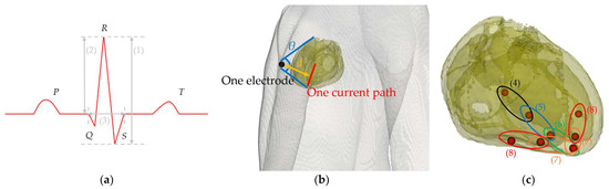 where and indicate the position vector of the i-th charge and the propagation velocity in the ventricles, respectively. The propagation velocities in the bundle of His, bundle of branches, and Purkinje fibers, which are the propagation pathways of the myocardial action potentials in the ventricle, were set as 1.25, 1.25, and 3.25 m/s, respectively [1] (see also Figure 4c).