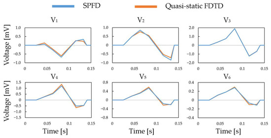 QRS waves in the chest leads calculated using the SPFD and quasi-static FDTD methods.