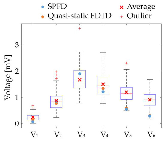 However, the quasi-static approximation can be used when the wavelength is sufficiently large relative to the size of the human body. The quasi-static FDTD method [30] is then used to reduce the analysis cost through quasi-static approximation. In this study, the quasi-static FDTD method was used to confirm the validity of the SPFD analysis results.