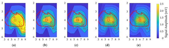 Contour plot of the ECG signal amplitude variability for different bipolar electrodes. The vertical and horizontal axes correspond to the rows and columns in Figure 3a. There are variations due to (a) physique, (b) heart size, (c) heart orientation, and (d,e) misalignment by 1 cm and 2 cm, respectively. The red oval corresponds to the heart’s position when the human body is viewed from the front. The red square indicates the position of the chest electrode in the standard 12-lead ECG as a reference.