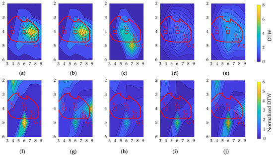 Contour plot of (a–e) DTW and (f–j) normalized DTW for different bipolar electrodes. Variations due to (a,f) physique, (b,g) heart size, (c,h) heart orientation, and (d,i) and (e,j) misalignment by 1 cm and 2 cm, respectively. The vertical and horizontal axes correspond to the rows and columns in Figure 3a. The red oval corresponds to the heart’s position when the human body is viewed from the front. The red square indicates the position of the chest electrode in the standard 12-lead ECG as a reference.