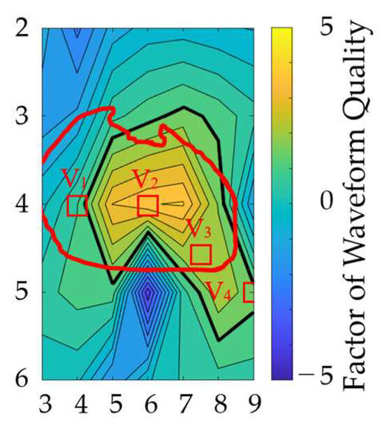 The locations of the bipolar electrodes that provide large-amplitude and less waveform distortion were evaluated in terms of the SA and normalized DTW. The SA and normalized DTW were normalized using the maximum value for each individual difference and electrode misalignment, and then their differences were defined as a factor of waveform quality. Figure 9 shows the factor of waveform quality computed from the results in Figure 7 and Figure 8b. The electrode positions of V1 to V4 in the standard 12-lead ECG are included in the region of electrode positions for the top 20% of the waveform quality.