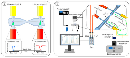 The excitation light was provided by a single-mode, pigtailed, in-fiber laser diode (LP520-SF15, Thorlabs) connected to the single-mode optical fibers by a 50:50 coupler (TW560R5F1, Thorlabs). The shined laser beam (λ = 520 nm) hit the facets of multimode fibers constantly during the experiment. The harvested optical signal was converted into electrical signals by two fast Si photodiodes (2 GHz bandwidth) (DET025AFC/M, Thorlabs) sampled at 100 kHz using a National Instruments (Austin, TX, USA) 16-bit data acquisition (DAQ) card—up to 3.5 MS/s/ch—and analyzed using a customized LabVIEW interface (National Instruments, LabVIEW 2017). To convert the photocurrent generated by the photodiodes into an output voltage, two load resistors were added to the connection between the photodiodes and the DAQ card. The resistances value was set to 5 kΩ to provide the best trade-off between the system bandwidth and the absolute channel voltage response. In this way, the multimode acquisition fiber could see a constant optical signal when there was no particle fluid in the photocell area, but when a cell passed through, it scattered and diffracted the light from the fiber, causing the signal to decrease as long as the cell intercepted the beam. Since the two pairs of photocells began recording at the same time, both providing an electrical signal, the transit time was obtained by computationally extracting the shift between the obscuration peaks in the two signals. The resolution concerning the obscuration time measurement was about 1 μs (see Supplementary Materials for more details (Figure S1)). Microfluidics experiments were performed under an optical microscope (BX53M, Olympus, Tokyo, Japan) connected to a high-speed camera (FASTCAM Mini UX100 type 800k-M-16G, Photron, Tokyo, Japan) in order to be able to characterize the fluidic behavior of the device as well, and to validate the results of the device measurements with high-speed videos (8000 fps, 1 s duration). To ensure good visualization of the flowing cells, the working inlet pressure was set to 50 mbar for all the experiments involving MCF-7 cells. However, it is important to highlight that the device was designed to work independently of any vision system.