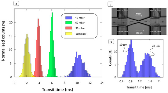 As the flow field velocity increased, due to an increase in inlet pressure, the transit times accordingly shifted to lower values. This result ensures the correct functioning of the device, as well as the correct operation of the peak detection algorithm. The relationship between size and transit time was also investigated by flowing a water-based solution of 10 and 20 μm particles. As expected, smaller beads showed shorter transit times, because their velocities were higher than those of larger particles [41]. Indeed, in Figure 2c, the transit time distribution is clearly divided into two main populations, which can be related to the two different particle sizes.