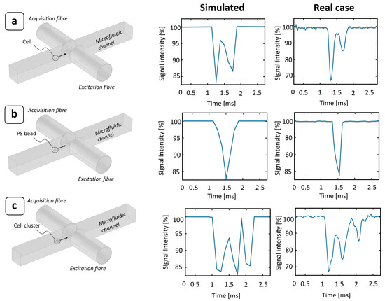 Effect of a particle passing through a photocell region: comparison between numerical ray-tracing simulations and experimental signal obtained under different conditions. The flowing particle was assumed to be spherical and to pass at the center of the microfluidic channel. The surrounding medium was modeled as DMEM (nm = 1.33) [44], while the particle was considered as (a) a single MCF-7 cell (nc = 1.4) [42]; (b) a single PS bead (nPS = 1.6) [43]; and (c) an MCF-7 cell cluster (6 cells).