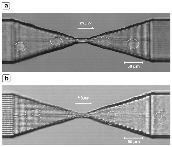 Experiments with MCF-7 cells. (a) Image of a cell (see dashed shape) squeezing through the constriction. (b) Cluster of MCF-7 cells (see multiple dashed shape) flowing through the constriction despite its size being significantly larger than the narrowing. The device shows a remarkable self-unclogging behavior thanks to the much higher Young’s modulus of the bulk substrate (fused silica) with respect to the flowing objects and the constriction length, which is significantly shorter than is usually found in the literature. The images were obtained by superimposing successive frames of a video recorded at 8000 fps with a 20× objective.
