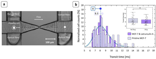 MCF-7 transit time measurement. (a) Overlapping of successive frames taken at 8000 fps showing the photocell-like behavior of the device. The cell flowing in the channel clearly crossed the light beam emitted by the optical fiber and interrupted the signal acquired by the opposite optical fiber, allowing the transit time to be accurately measured. The image was taken using an optical microscope with 10× objective. (b) At an injection pressure of 50 mbar, the shift between the two medians (continuous curves) of the transit time distributions was 0.3 ms. Since Latrunculin A acted on the cell deformability, increasing it, the transit time required to pass through the constriction was shorter than for untreated cells. Inset: the box plot of the transit times with and without the presence of the drug. The median transit time of the MCF-7 cells exposed to Latrunculin A was significantly lower than that of unexposed cells ( * Mann–Whitney U test, p-value < 0.05).