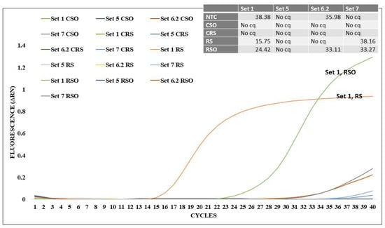 LAMP primer set analysis against the integrase region. Four LAMP primer sets were generated against the integrase-coding region, named in this figure as Set 1, Set 5, Set 6.2, and Set 7. HEK293 cells were transfected with HIV-1 NL4-3 isolate. The supernatant of the transfected HEK293 cells was used to infect RevCEM-D4 cell cultures. The primer sets were tested against cells and supernatant, or supernatant only from RevCEM-D4 D4 cells. NTC—No template control; CSO—Control RevCEM-D4 cells, supernatant only; CRS—Control RevCEM-D4 supernatant and cells; RS—RevCEM-D4 supernatant and cells; RSO—RevCEM-D4 supernatant only.