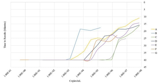IN-1 primer sets were able to accurately detect the presence of all seven subtypes of HIV-1 (A–G) within 30 min. The B subtype exhibited the shortest average TTR of about 11.5 min, while subtype C showed the longest average TTR of about 24 min. The average of the remaining subtypes fell between these time points (Figure 4).