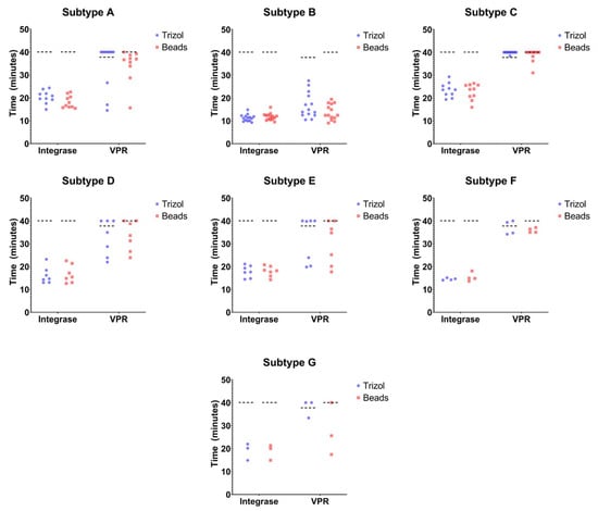 Analysis of viral isolates from subtypes A-G. RNA was extracted from cell-free viral preparations of viral isolates from 7 viral subtypes (A to G). Two RNA extraction methods were compared (TRIzol and magnetic beads for IN and VPR across HIV-1 subtypes A–G). TRIzol or magnetic beads were used to extract HIV-1 RNA from plasma samples containing HIV-1 subtypes A–G. The extraction methods were assessed through LAMP using primer sets designed against integrase, or VPR. The time, in minutes, is provided for each condition. The cutoff time was set to 40 min.