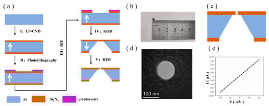 The process flow for the preparation of Si3N4 chips is shown in Figure 1a. The chip has a square shape with an overall size of 2.4 mm × 2.4 mm. Figure 1b shows a mobile phone photo of the Si3N4 chip. The specific steps are as follows: (I) A silicon wafer with a thickness of 200 µm was selected as a substrate with a crystallographic orientation plane of (1, 0, 0). Then, a layer of low-stress Si3N4 film with a thickness of 200 nm was deposited on the upper and lower surfaces of the silicon wafer substrate by the low-pressure chemical vapour deposition method using SiH2Cl2 and NH3 as the reaction gases. (II) One of the Si3N4 layer surfaces was coated with photoresist, which is defined as the backside of the chip (in the direction indicated by the white arrow), and a square photoresist window was patterned using photolithography. (III) Using RIE and employing CHF3, SiF6 and He+ as etching gases, Si3N4 in the square window unprotected by the photoresist was etched away, exposing the silicon substrate and removing the photoresist. (IV) The silicon substrate was etched via wet etching using a 30% KOH solution, heated in a water bath environment at 80 ℃ for 6 h and etched inward starting from the release window. Given that different crystal faces in the silicon crystal have different corrosion rates, the etching direction of the alkaline solution started from the exposed silicon window and etched downward along the (1, 1, 1) crystal face, eventually terminating after reaching the Si3N4 layer on the other side. As a result, a square Si3N4 self-supported membrane of 5 × 5 µm was obtained. (V) A 100 nm nanopore aperture was prepared on a silicon nitride substrate via HIM. Figure 1c shows the overall picture of the Si3N4 chip, Figure 1d shows the TEM image of the Si3N4 nanopore and Figure 1e shows the I−V diagram of the Si3N4 nanopore chip in 1 M KCl solution, which shows good linearity, indicating a good pore pattern. The entire Si3N4 substrate with nanopores serves as the take-up window for the layup of the graphene membrane in the subsequent steps.
